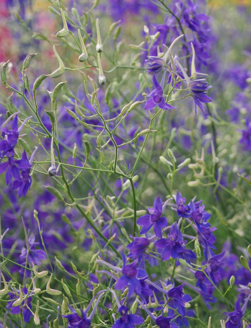 Eenjarige ridderspoor is er in roze, wit, lila en (paars)blauw. 'Blue Cloud' heeft licht lilablauwe bloemen. Waar de vaste ridderspoor met zijn grote toortsen statigheid en aristocratie uitstraalt, is Consolida een en al speelsheid. Rankend steekt ze overal haar blauwe neusje tussen. De hele zomer zal ze bloeien, ongeremd en vrijuit. Een takje blauw in een vaasje lift een heel boeket op. Het jaar erop zul je opnieuw zaailingen aantreffen.